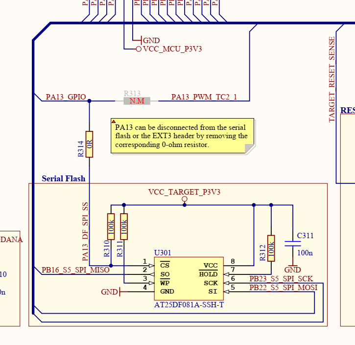 2. PA13 is by default connected to the Serial Flash SS line and is disconnected from the EXT3 PIN8.