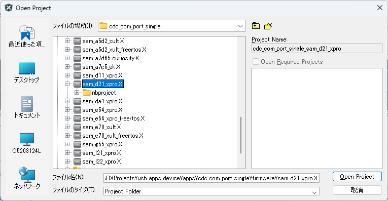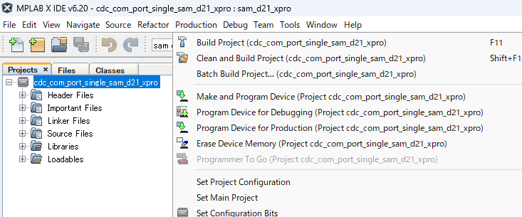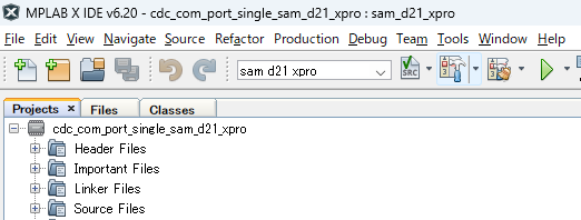 MPLABの[File]-[Open Project]で usb_apps_device\apps\cdc_com_port_single\firmware\sam_d21_xpro.X を開く。
