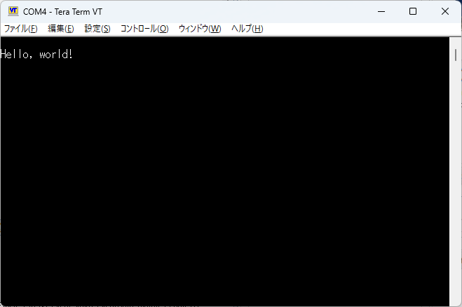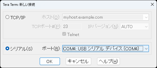 USBケーブルをTARGET USBポートに差し替えてTeraTermでCOMポートを開いてみた。COM4になっていた。