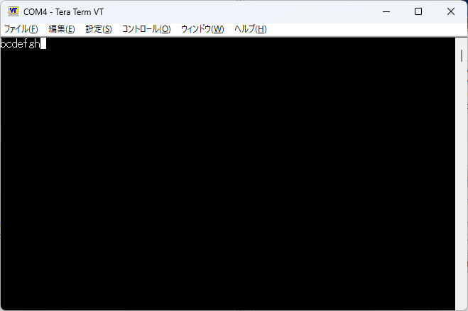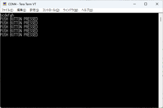 abcdefgと入力するとbcdefghと返ってきた。とりあえず動作しているようだ。また、SW0を押すとメッセージが表示された。