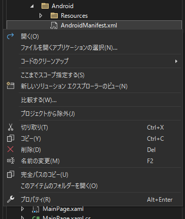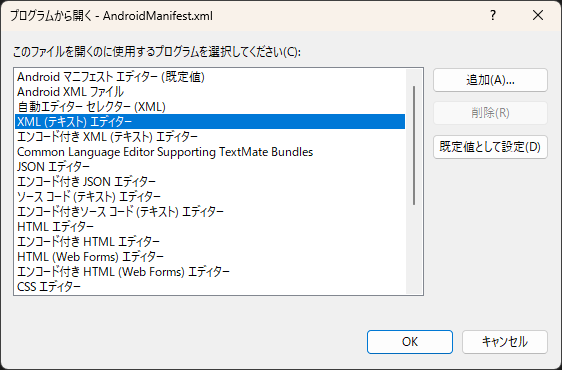 ソリューションエクスプローラでAndroidManifest.xmlを開くと、デフォルトでAndroidManifestエディターが起動する。これで設定できる内容ならばいいのだが、AndroidManifestエディターにメニュー項目がない場合はxmlファイルを直接編集しなければならない。デザイナー/エディターの選択タブのようなものも見当たらない。どうすればいいのか。